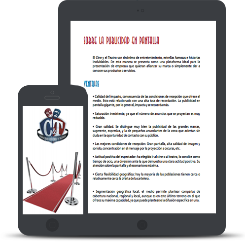 En C&T publicidad nos dedicamos a generar nuevos espacios de publicidad en Cines y Teatros, tanto en pantalla como por medio de acciones de promoci贸n, est谩tica y otras alternativas que permiten que su empresa cuente con una alternativa apropiada para dar a conocer su propuesta